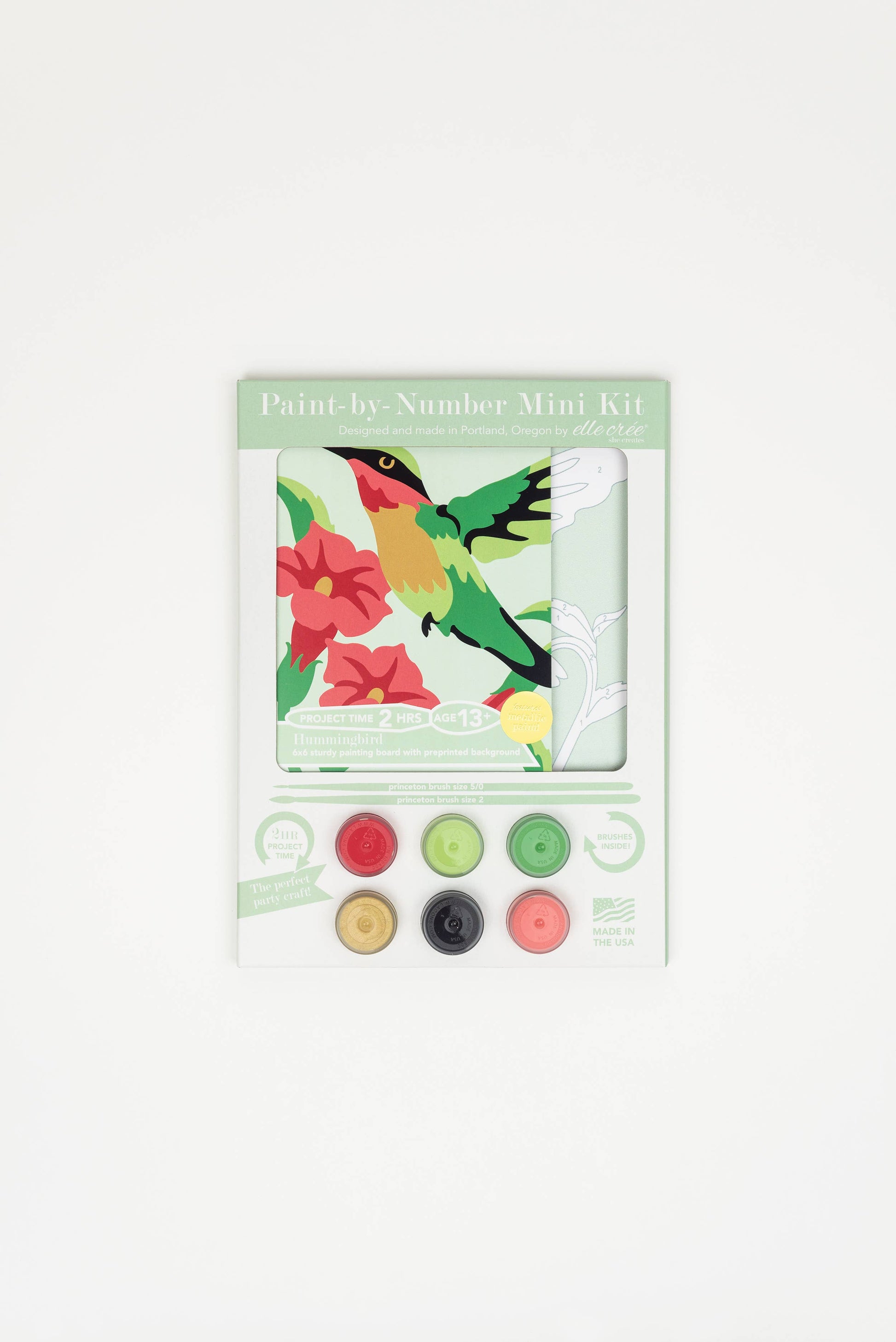 Contents:(1) 6”x6” sturdy 100% paper painting board, (6) American-made acrylic paints, (2) reusable synthetic sable hair paint brushes, instructions. Made in Portland, Oregon.